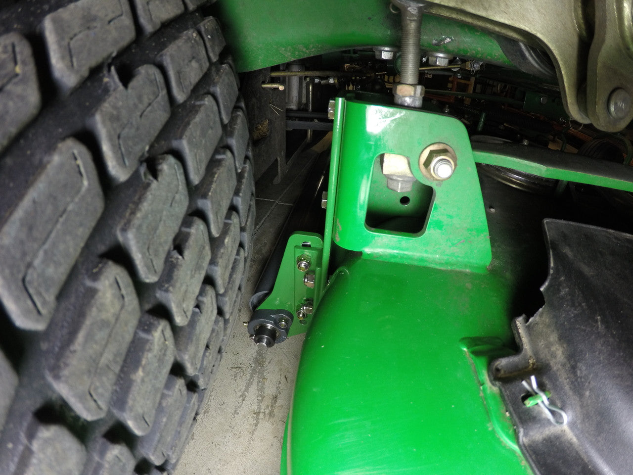 - Mounts on the mower deck predrilled holes spaced 29.5" apart.