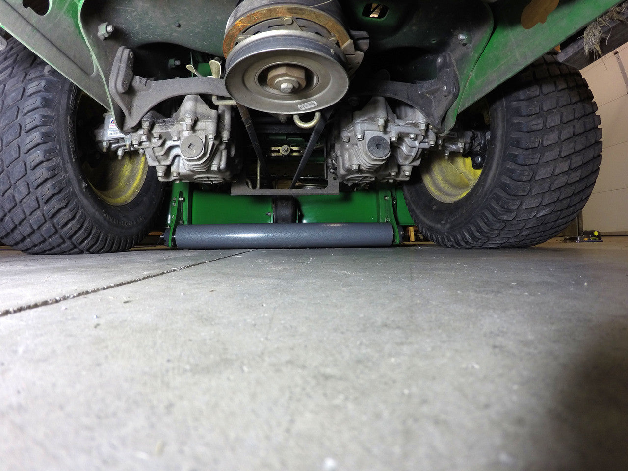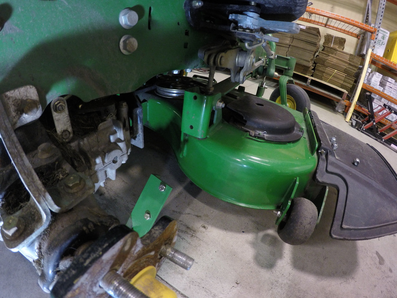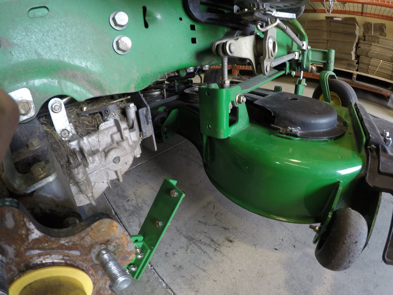 - Mounts on the mower deck predrilled holes spaced 29.5" apart.